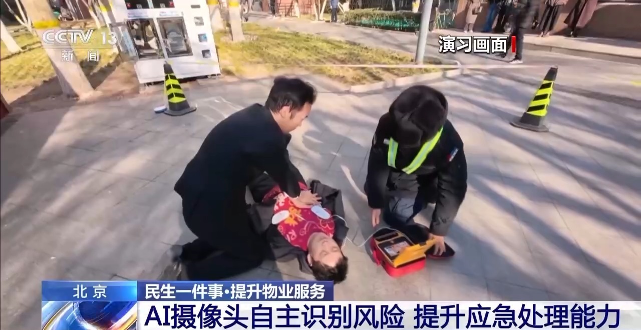 物业项目总经理 韩惠:这个小区常住的户数超过了3800户,居住的人口已经超过了8000人,其中有三分之一为60岁以上的老人。针对这样的特殊人群,我们有这样一个行动,现场的演练和我们的AI系统是联动的,现场一旦出现这种突发情况,后台会第一时间识别,并且联动现场的工作人员,在黄金4分钟之内对客户进行抢救。