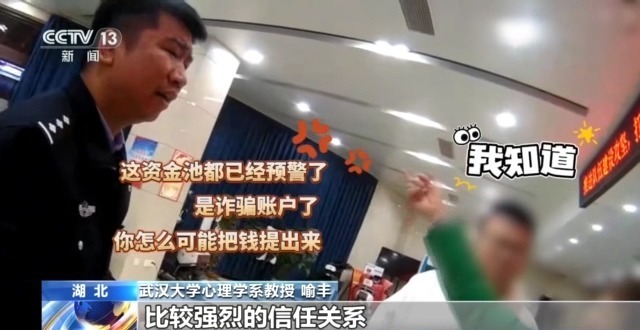 武汉大学心理学系教授 喻丰:被害人已经投入了大量的时间、情感,有时候还有小额的资金,甚至和诈骗者建立起了比较强烈的信任关系。然后这个诈骗者又挑起了他的一些财富梦想,这个时候如果他承认自己被骗了,其实就是承认自己没那么明智,然后又比较贪婪,所以他宁可相信所谓的警察不懂等荒唐的理由,也要维护自己的形象。被害人还会选择性注意,他只听得到支持自己信念的那些信息,然后对警察出示的相反的证据会自动过滤。