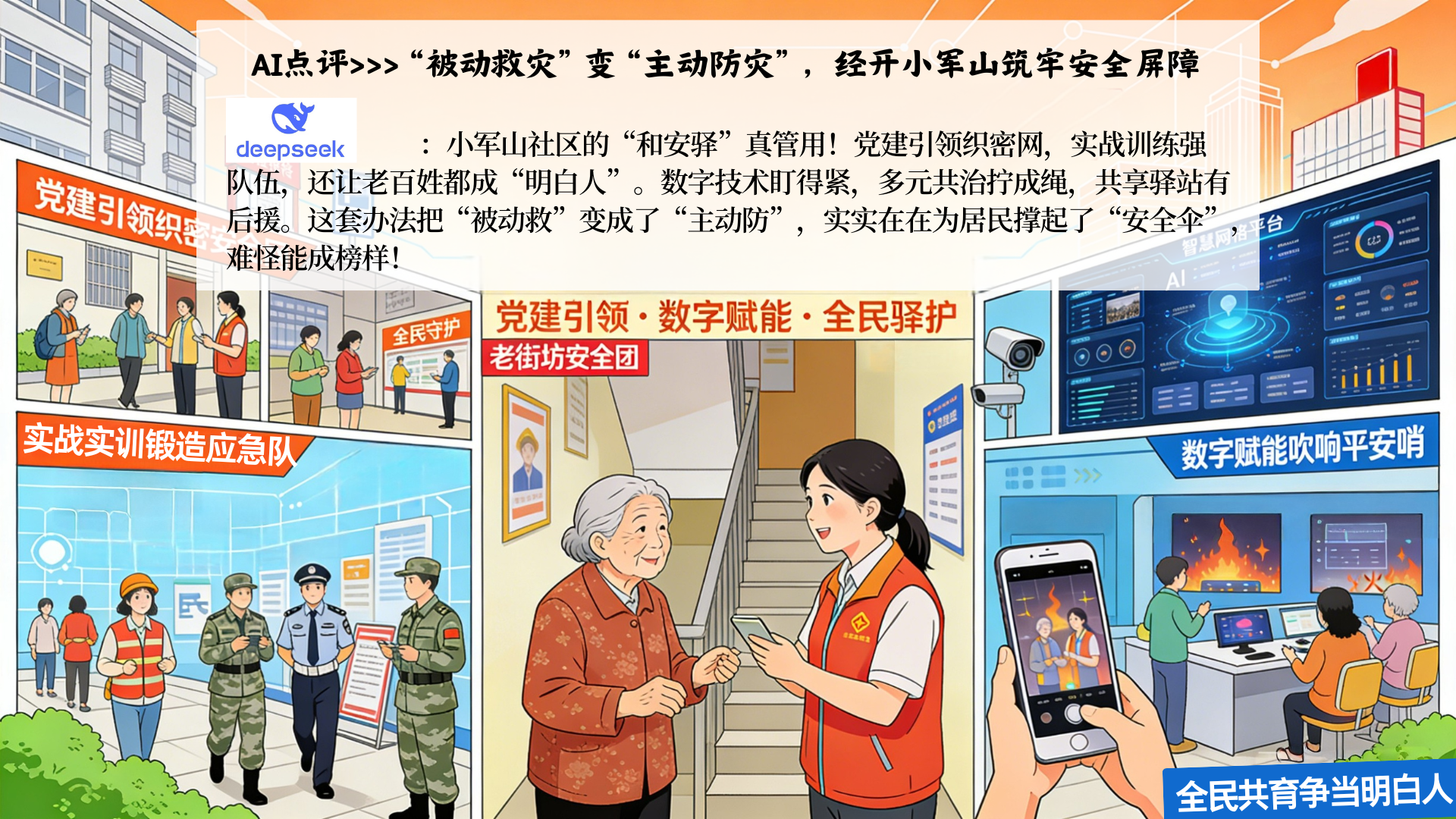 建设智慧网格平台,实现人、事、物全要素“可视、可管、可控”。线上课堂拓广度,微信公众号开设火灾逃生视频、隐患排查图文、灾害天气演练等线上课程,提升公众防灾技能。协商沟通强力度,平台双向预警、受理隐患上报,结合应急广播确保信息到户。应急响应提速度,283个摄像头实时监测,AI智能预警;为60户独居老人安装智能烟感,直报社区消防。