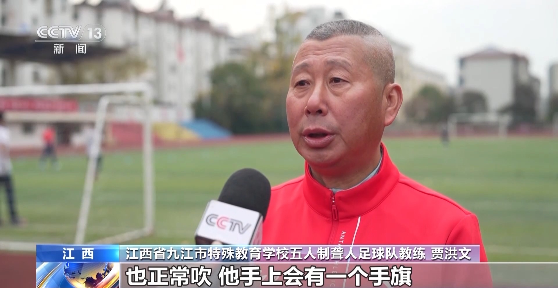 江西省九江市特殊教育学校五人制聋人足球队教练 贾洪文:大体方向和规则规程是一样的,裁判执行的尺度都是一样的,比如说裁判在“执法”的时候吹哨也是正常吹,他手上有一个手旗,这个手旗起到什么作用?那是给聋人看的。