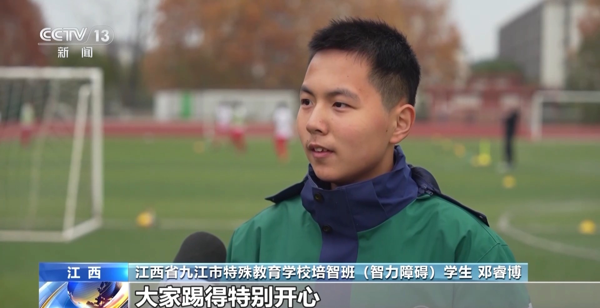 江西省九江市特殊教育学校培智班(智力障碍)学生 邓睿博:大家踢得特别开心,每个星期两次,我们有时候是踢比赛,有时候是在操场上训练,我感到非常自豪,赢了之后最高兴又开心。