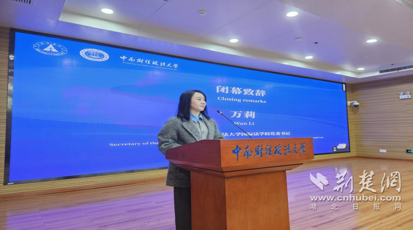 中南财经政法大学国际法学院党委书记万莉致闭幕辞。万莉充分肯定本次研讨会取得的丰硕成果,认为会议有效衔接了理论前沿与合作实践,形成的广泛国际共识将促进未来的区域与国际合作。万莉表示,学院将继续致力于搭建高水平学术平台,深化全球卫生健康法治研究,为构建人类卫生健康共同体持续贡献法学智慧与人才力量。