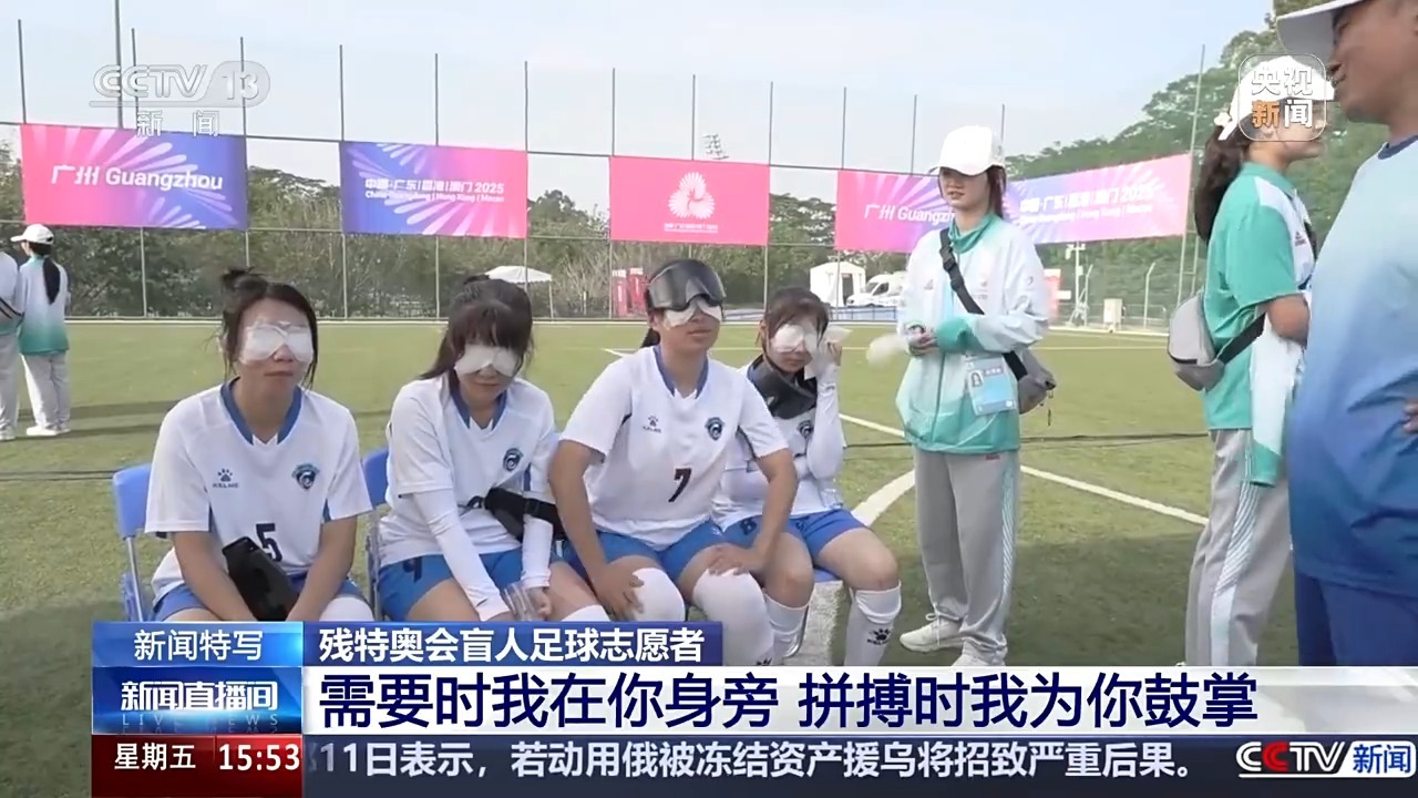 全国第十二届残疾人运动会暨第九届特殊奥林匹克运动会正在粤港澳三地火热进行。今天是盲人足球项目的第六个比赛日。盲人足球是专为视力残疾的运动员设立的比赛项目,除了守门员,其他运动员都需要佩戴眼罩,在完全黑暗的情况下,凭借足球内部的铃铛声、队友的引导声进行比赛。在赛场边,志愿者也在用专业和细致的工作,保障运动员们顺利完赛。
