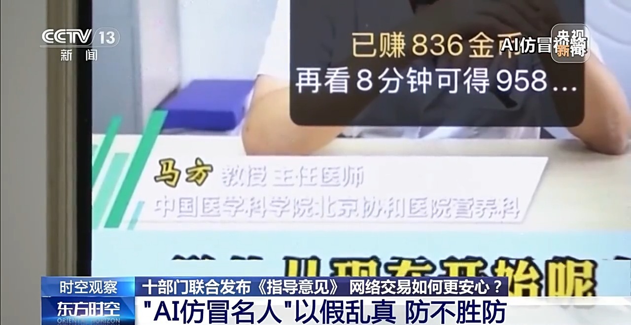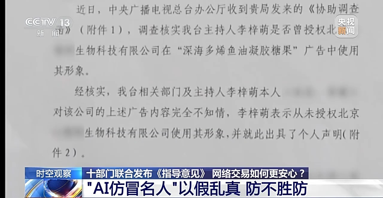 据北京协和医院介绍,不少知名专家被AI换脸,用于“养生”“瘦身”等虚假宣传,甚至还有不法商家利用AI生成假医生,打着北京协和医院的旗号,销售各类商品,误导消费者。不只是在医疗健康领域,记者调查中发现,还有多位公众人物的形象被擅自用于商业推广。今年年初,北京市海淀区市场监管局接到消费者举报,一直播间宣称一款鱼油产品具有医疗功效。该账号发布的短视频中,出现了中央广播电视总台主持人李梓萌的形象。