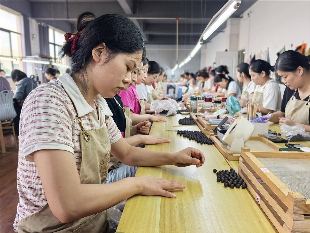 生产线上,女工鲁三燕灵巧地搓着香珠。“以前在外地打工,最亏欠孩子。”她笑容舒展,“现在能接送孩子、放假同步,顾家挣钱两不误,月收入有四千多。”