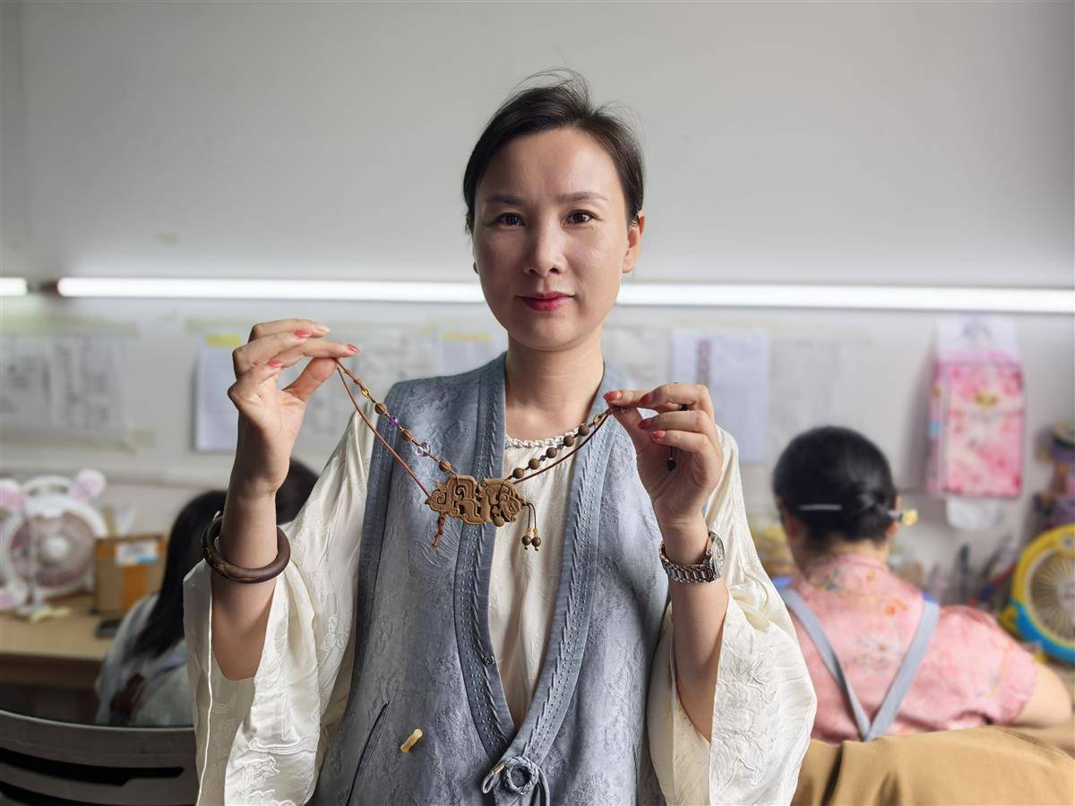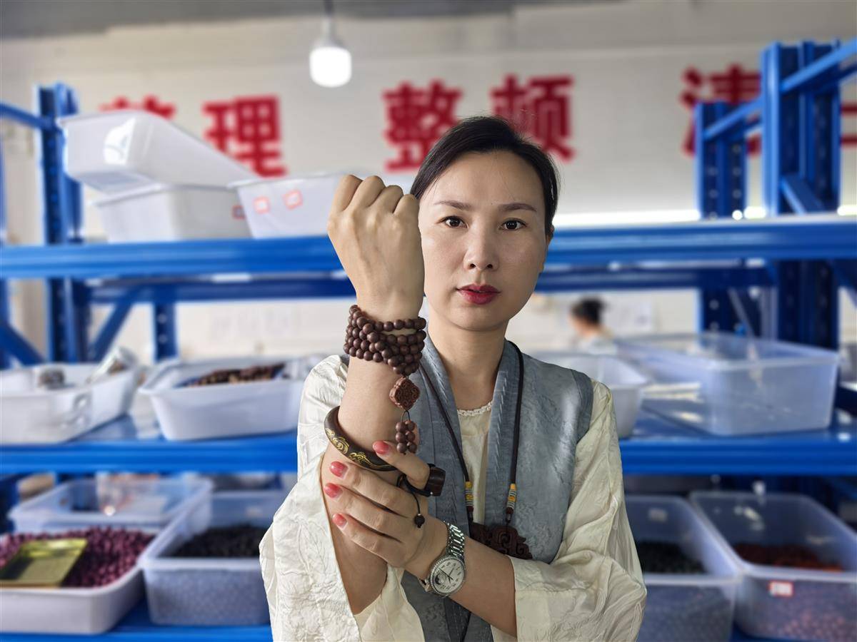 聂恋展示合香珠手链和手镯。(湖北日报全媒记者 方桐 摄)