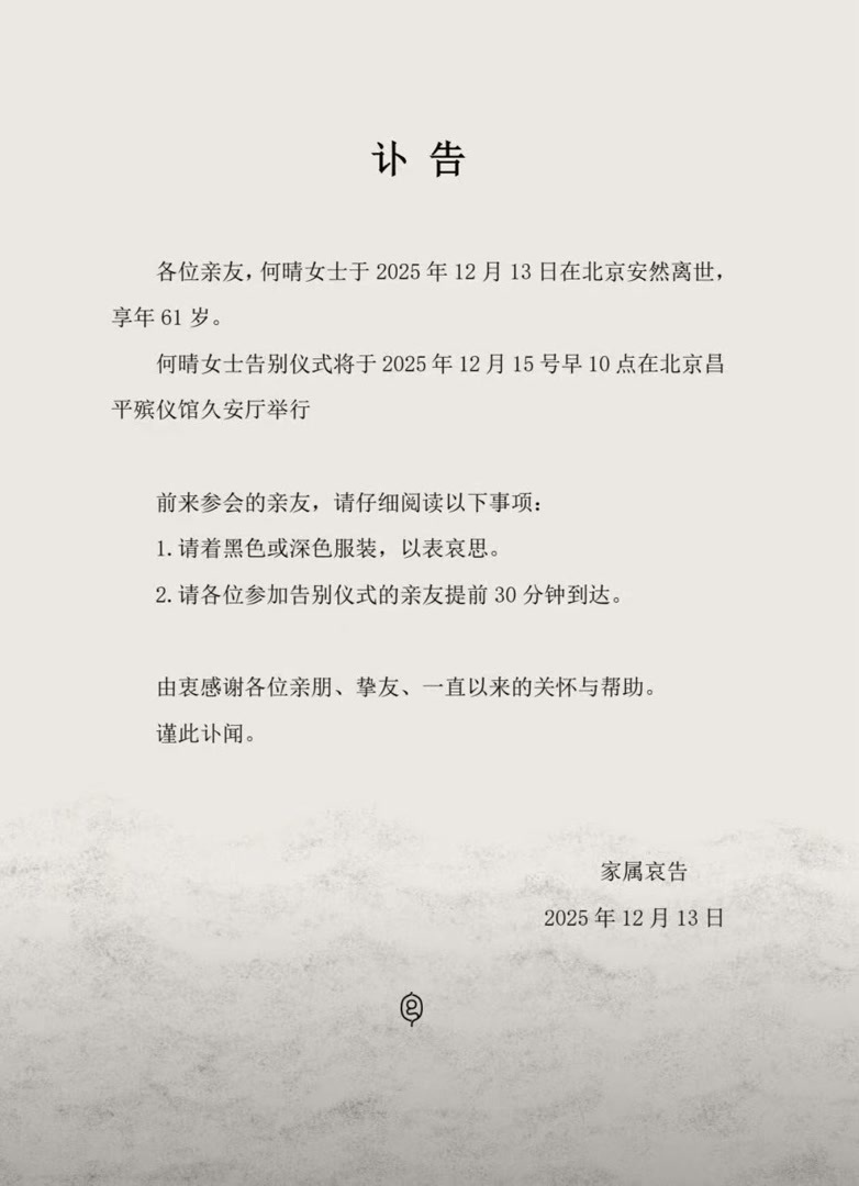 12月13日,著名演员何晴家属发布讣告显示,何晴在北京安然离世,享年61岁。告别仪式将于2025年12月15日早10点在北京昌平殡仪馆久安厅举行。