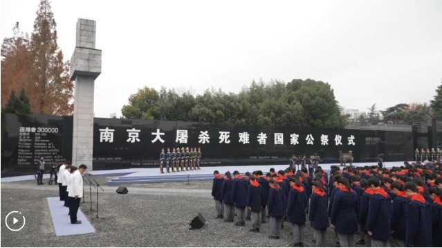 At the square of the Memorial Hall of the Victims in Nanjing Massacre by Japanese Invaders, thousands dressed in dark attire gathered with white flowers pinned to their chests. China's national flag was flown at half-mast in front of the crowd that included survivors of the massacre, local students and international friends.