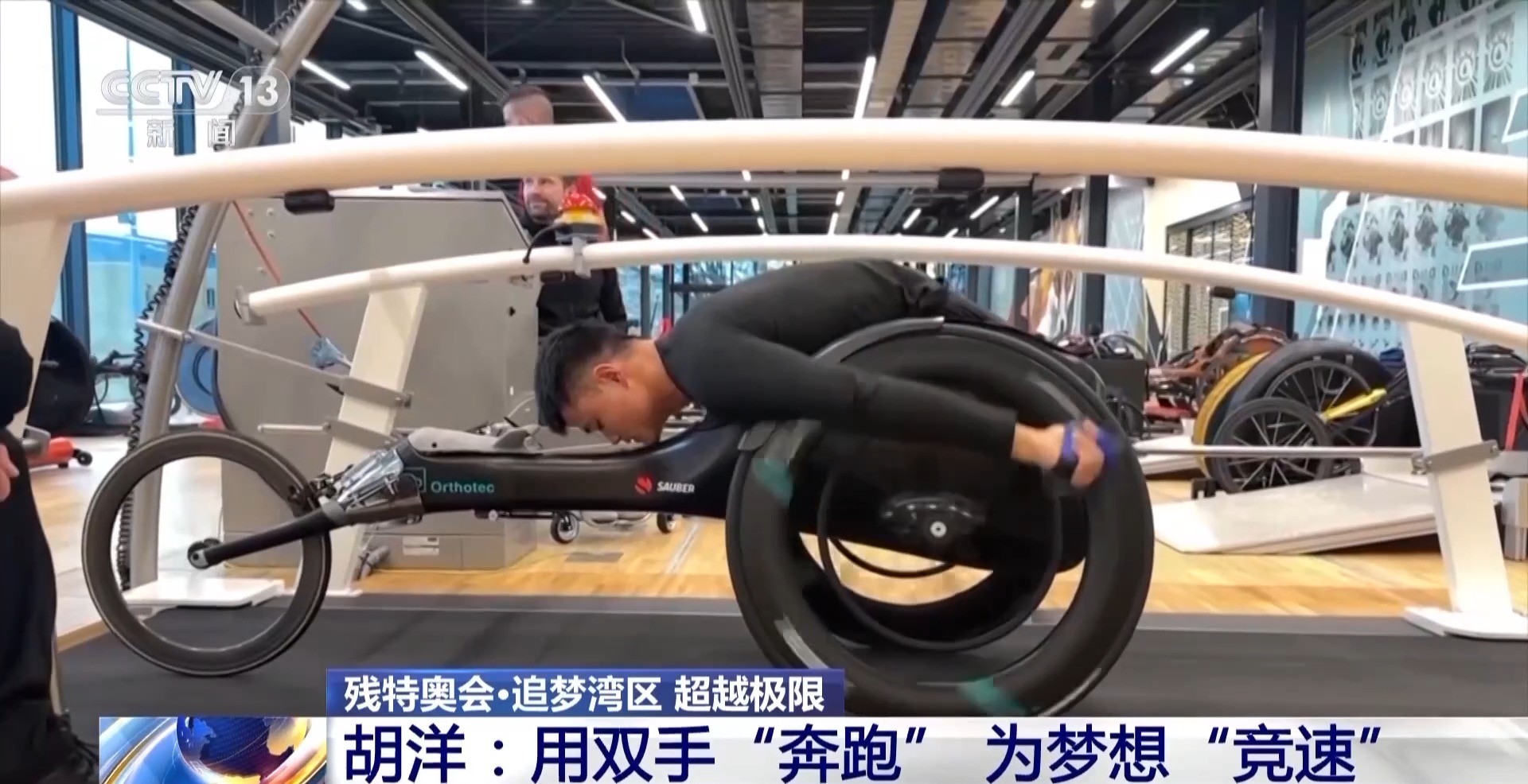 轮椅竞速比赛提速的关键在于“人车合一”,而胡洋发现,他残缺的左腿,很难适应传统的“跪姿”,两年间,他与教练大胆尝试,将“跪姿”改为“坐姿”——将单腿向前伸展,以全身核心力量驱动车轮,这一姿势的改变让胡洋的成绩大幅提升。2024年巴黎残奥会上,胡洋作为中国队田径4×100米接力赛选手,和队友们以45.07秒的成绩摘得金牌并打破世界纪录。