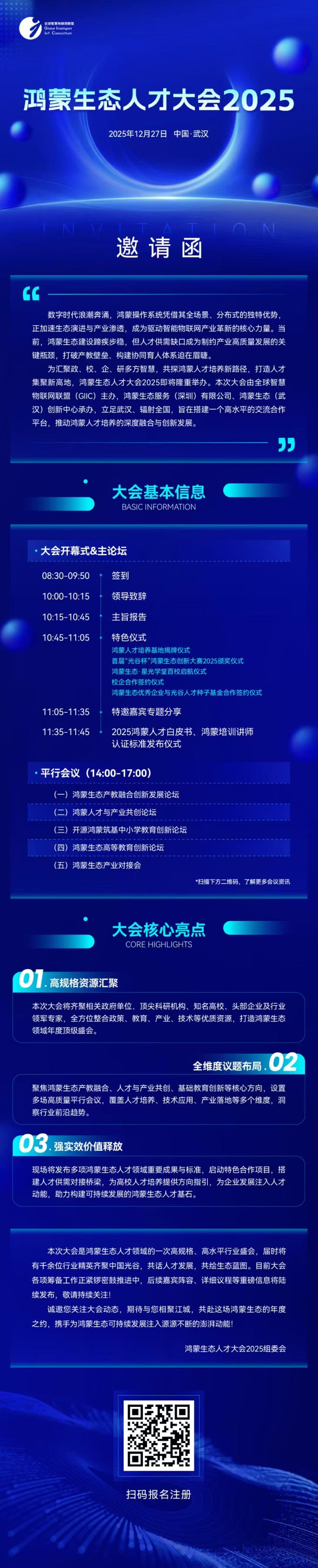 荆楚网(湖北日报网)讯(记者 张扬 周梦伊)聚焦鸿蒙生态建设与人才培养核心命题,赋能数字经济高质量发展。2025年12月27日,以“新生态、新人才、新动能”为主题的2025鸿蒙生态人才大会将于光谷举办。本次大会由全球智慧物联网联盟(GIIC)主办,鸿蒙生态服务(深圳)有限公司、鸿蒙生态(武汉)创新中心联合承办,拟邀请相关主管部门、高校、培训机构、用人单位、智库、核心开发者及媒体代表等超1000人,覆盖鸿蒙人才产业链上下游全生态,共商鸿蒙人才培养体系建设,共话产业生态协同发展新路径。