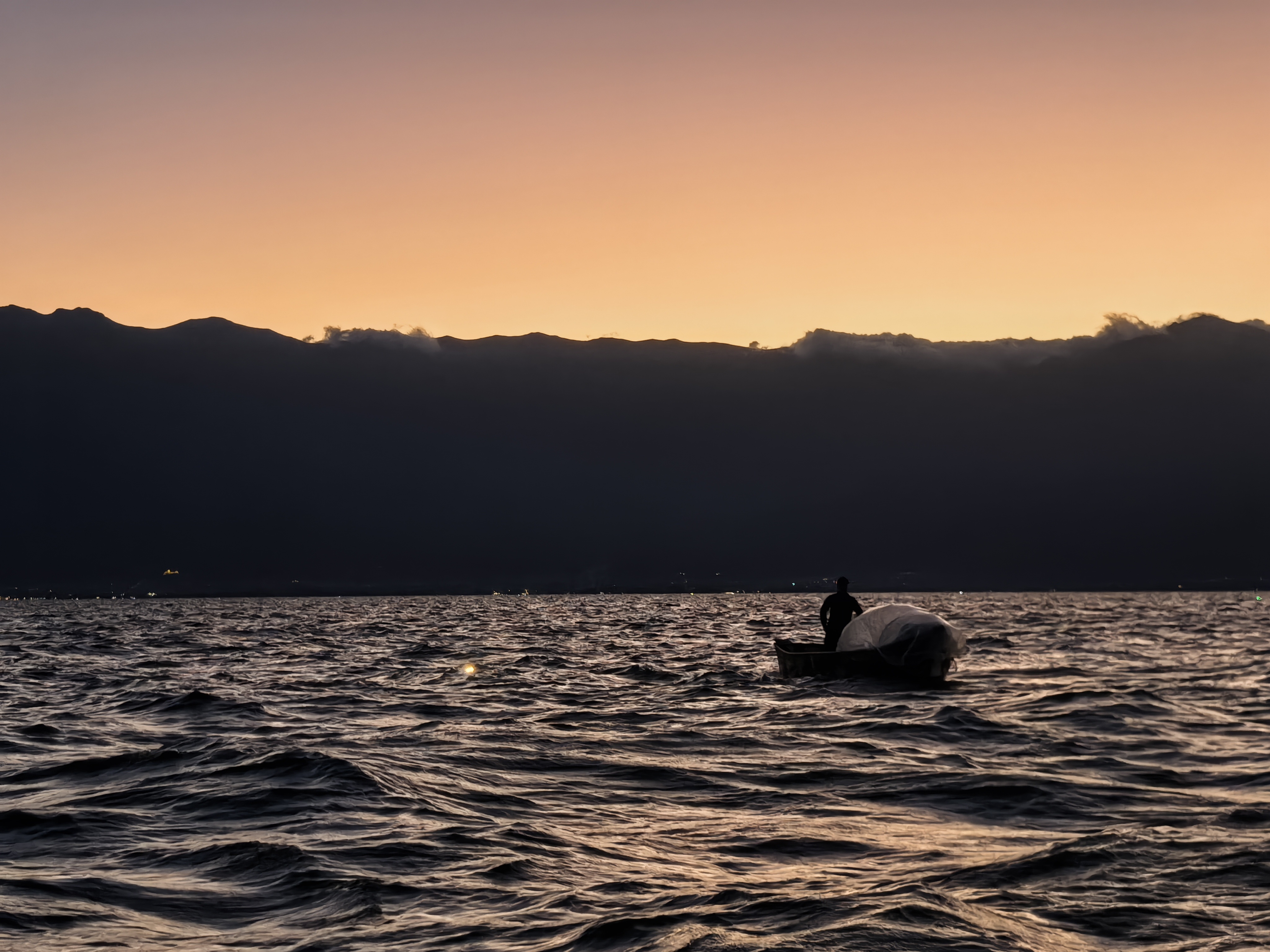 日落时刻,一艘艘作业船只驶入洱海,渔民们在余晖中熟练地下网。武文雯摄。