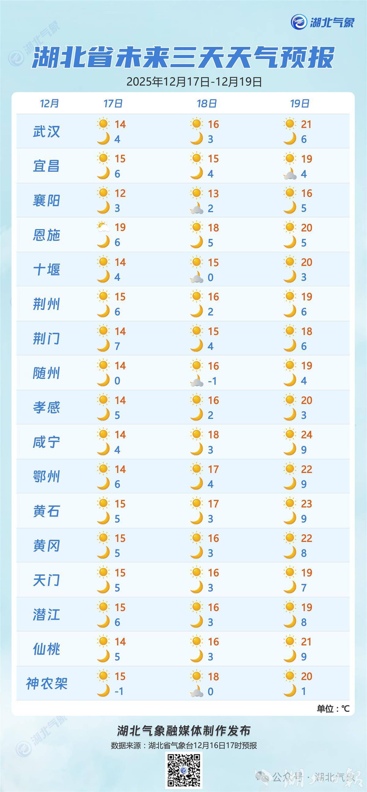 湖北日报讯(记者曾莉)12月16日,湖北开启回暖模式,全省晴到多云,下午3点省内大部气温13至19℃,相较15日同一时次升温1至5℃,大冶气温最高达20.1℃。预计未来三天全省晴天到多云,19日高温升至20℃。