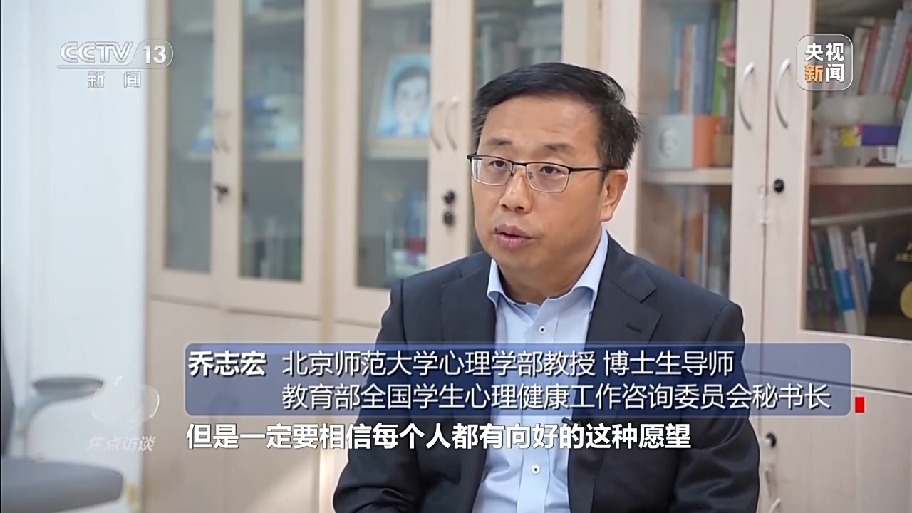 北京师范大学心理学部教授、博士生导师 教育部全国学生心理健康工作咨询委员会秘书长 乔志宏:学生内在的负面情绪体验,积累到一定程度,由于找不到应对困境的办法,所以暂时走不出来。但是一定要相信每个人都有向好的愿望,每个孩子内心都有着非常强烈的希望自己能够变好、能够有成长有发展的动机。
