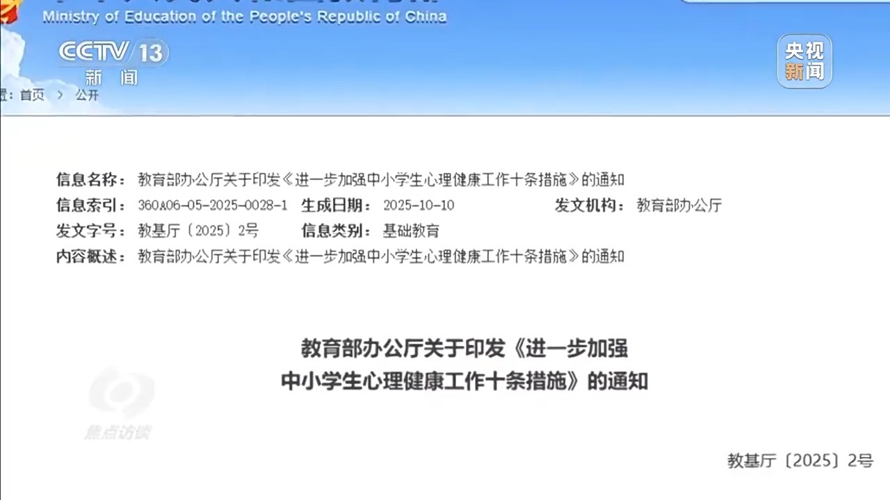 面对青少年心理健康问题,教育部门出台了一系列政策措施。今年10月,教育部印发《进一步加强中小学生心理健康工作十条措施》,也就是“育心十条”,希望通过具体可行的举措,为孩子们的心理健康保驾护航。