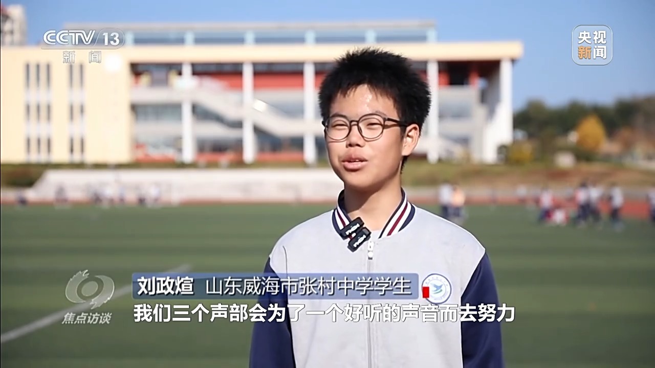 山东威海市张村中学学生 刘政煊:在合唱团里,三个声部会为了一个好听的声音而去努力,这让我感受到了合作的重要性,跟同学打成一片,拥有了自己的好兄弟好哥们儿,让我感受到了大家庭的温暖。