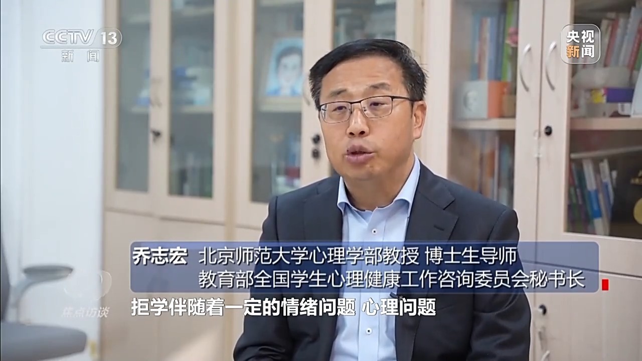 北京师范大学心理学部教授、博士生导师 教育部全国学生心理健康工作咨询委员会秘书长 乔志宏:拒学伴随着一定的情绪问题、心理问题,对学校感到恐惧、厌恶、沮丧,也可能是感到无聊或者伤心,校园环境失去了吸引力。它是孩子在成长过程中暂时性无法应对外部困难和挑战的一种退缩现象,是一种自我保护,把他从一个无法面对和无法应对的环境里面保护起来,所以它是一个复杂的信号。