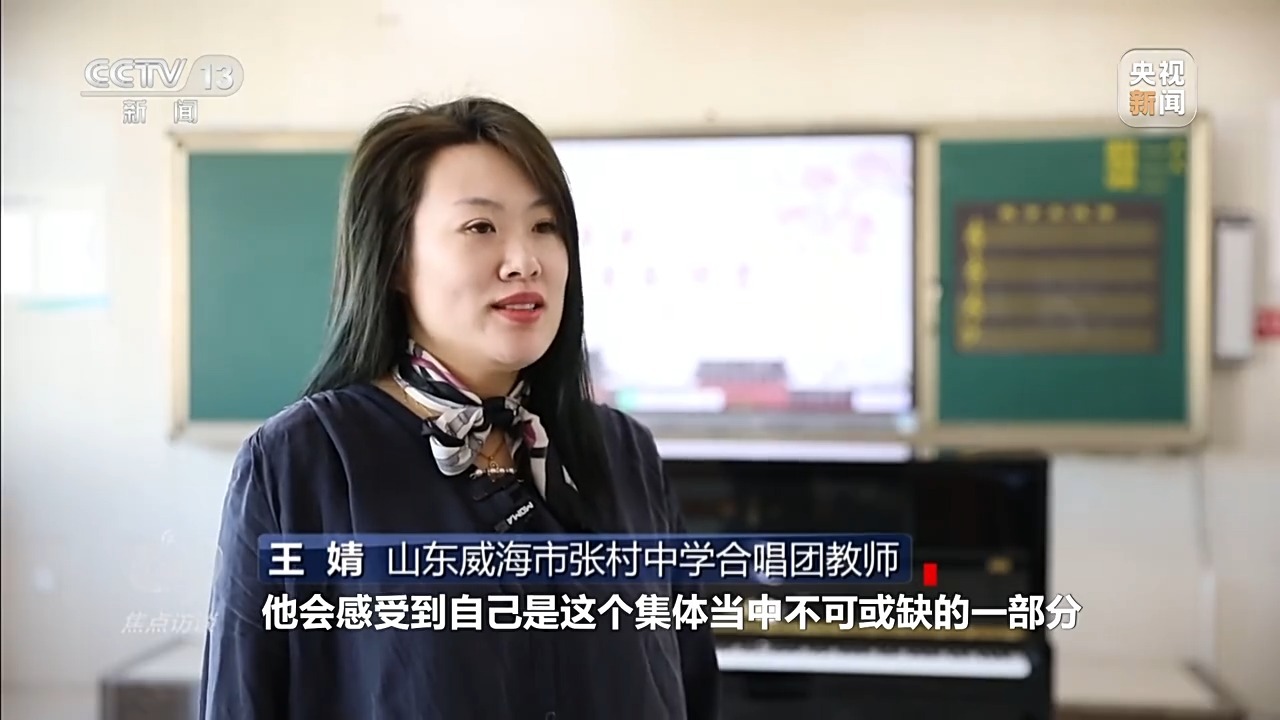 山东省威海市张村中学合唱团教师 王婧:孩子们在反复打磨的过程到作品完成表演的阶段,会感受到自己是集体中不可或缺的一部分,这种归属感会很好地减少内心中不自信、孤独的感觉。