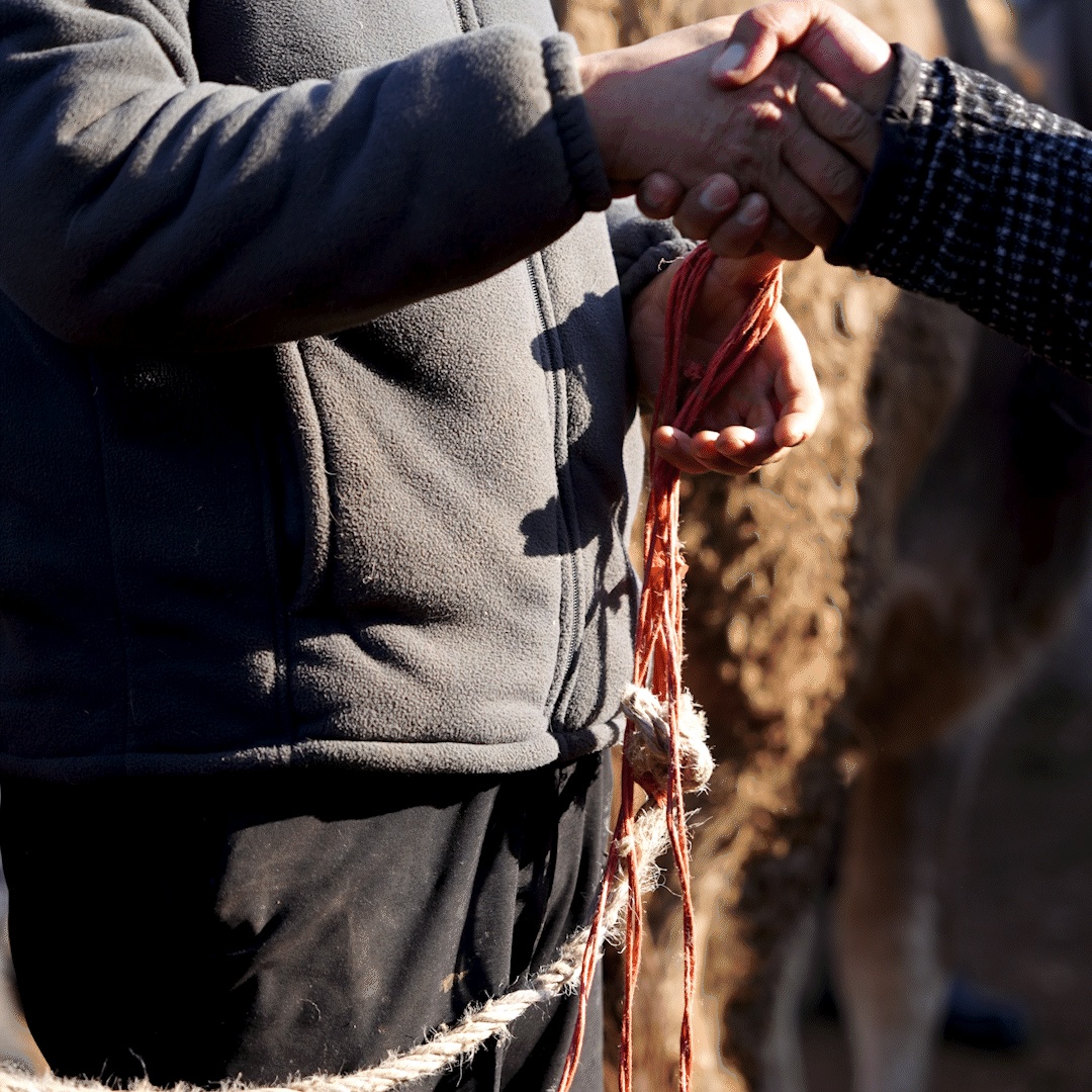 在新疆创锦黄公农产品交易市场,交易达成后,牲畜经纪人马军(右)与售牛的村民握手致意。