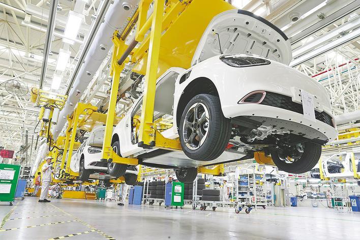 东风汽车纳米科技(襄阳)有限公司,工人正在赶制出口白俄罗斯的新能源汽车。 (视界网 王虎 摄)
