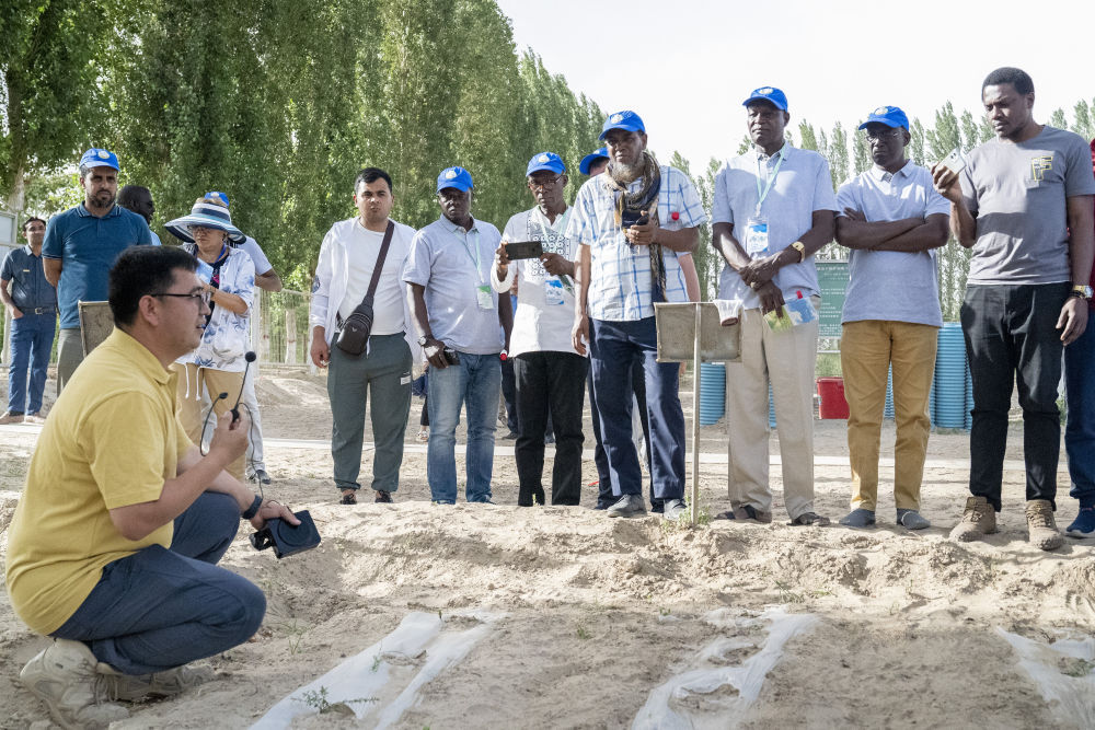 2023年6月12日,在塔克拉玛干沙漠机械防沙示范区,非洲和中亚学员参观固沙新技术。