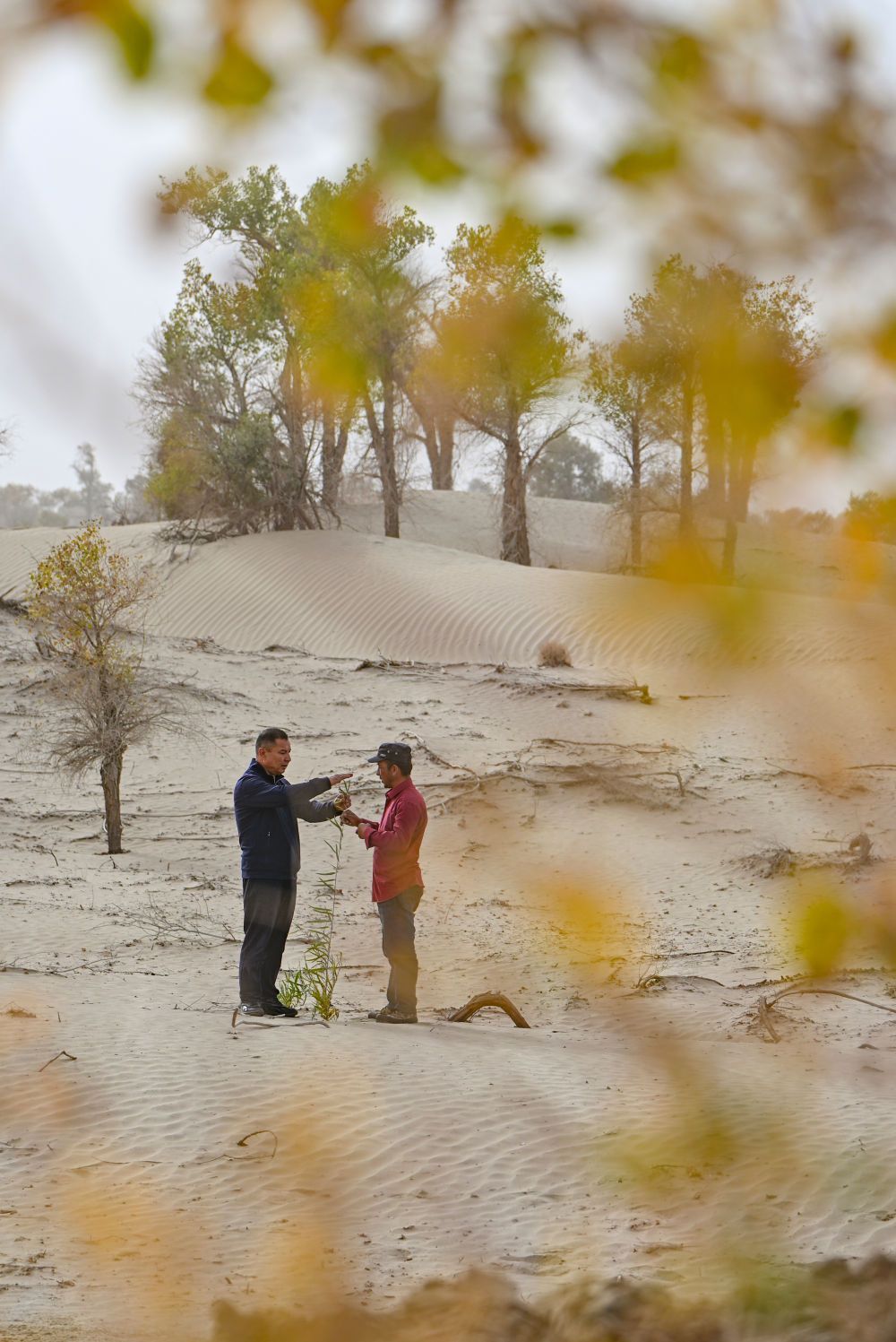 2025年9月19日,新疆巴音郭楞蒙古自治州尉犁县国有林管理局护林员艾力·尼亚孜(左)和同事在管护一株新长出的胡杨树苗。