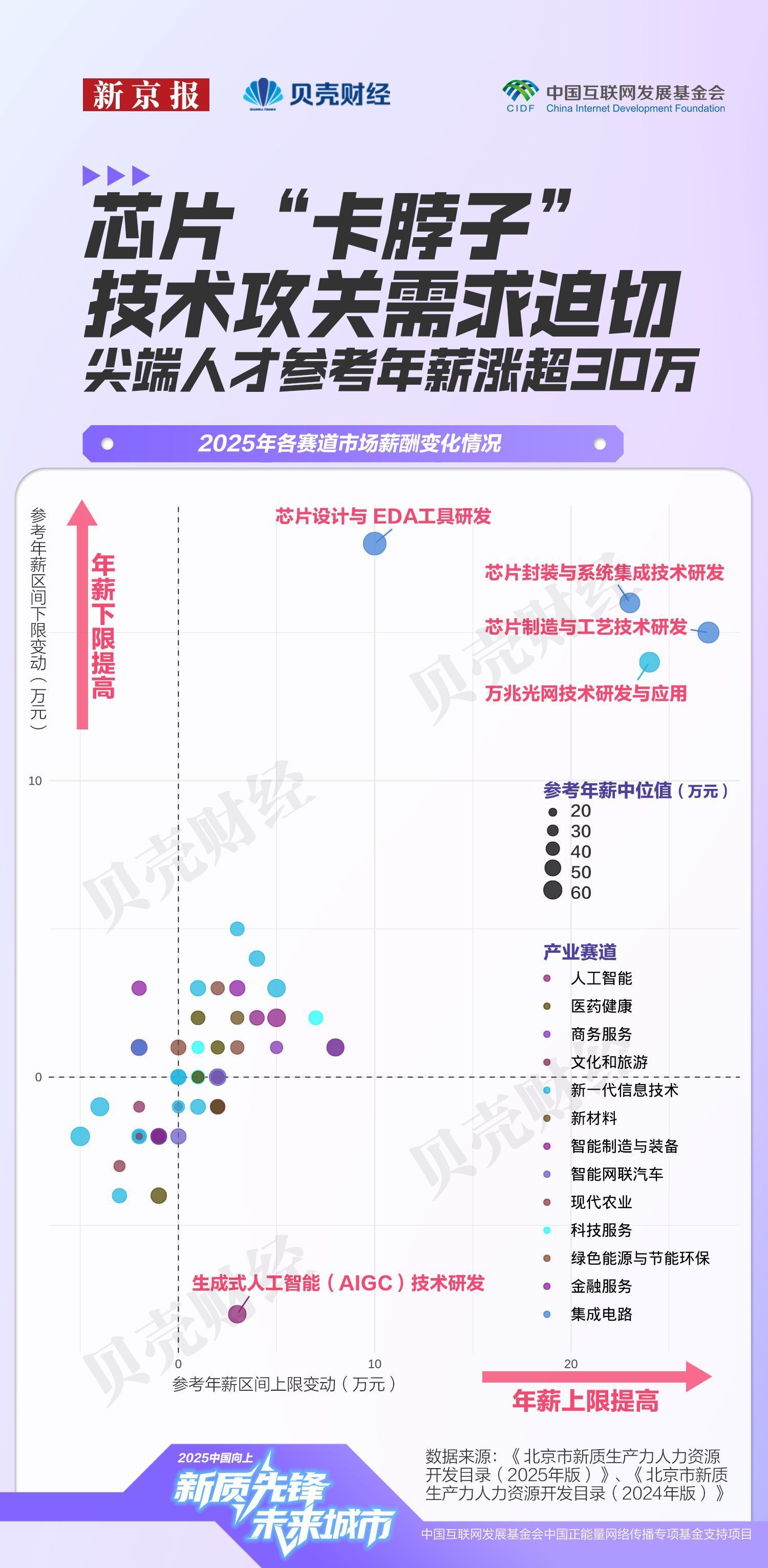 这种趋势并非集成电路产业独有。新京报贝壳财经记者基于《目录》统计发现,在与2024年具有可比数据的52个核心领域中,30个领域的参考年薪上限提高,占比近六成,其中20个领域薪酬区间整体上移。