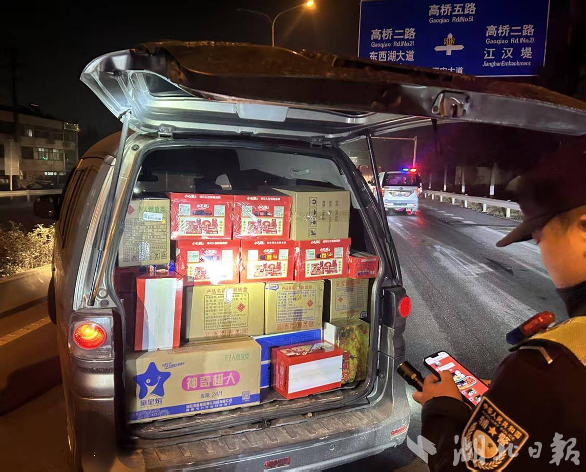 12月6日凌晨1时许,一辆SUV新能源车在洪山区分局张家湾检查站的卡点被拦下。民警观察到前排一男一女面色紧张,当打开其后备箱时,竟发现里面藏有42箱未拆封的烟花爆竹。