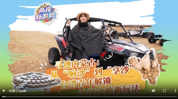 两岸新发现,内蒙古新体验!台湾青年演员姬天语打卡内蒙古自治区鄂尔多斯市响沙湾旅游景区,解锁沙漠文旅新玩法。曾几何时,地处库布齐沙漠边缘的响沙湾是一片贫瘠荒凉的沙海,寸草难生。如今,“以绿生金、以金护绿”的可持续发展理念让茫茫沙海焕发出新的生机与活力。昔日人迹罕至的荒漠,已经变成了吸引五湖四海游客的旅游景区。让我们一起走进响沙湾,感受“旅游度假新顶流”的魅力。