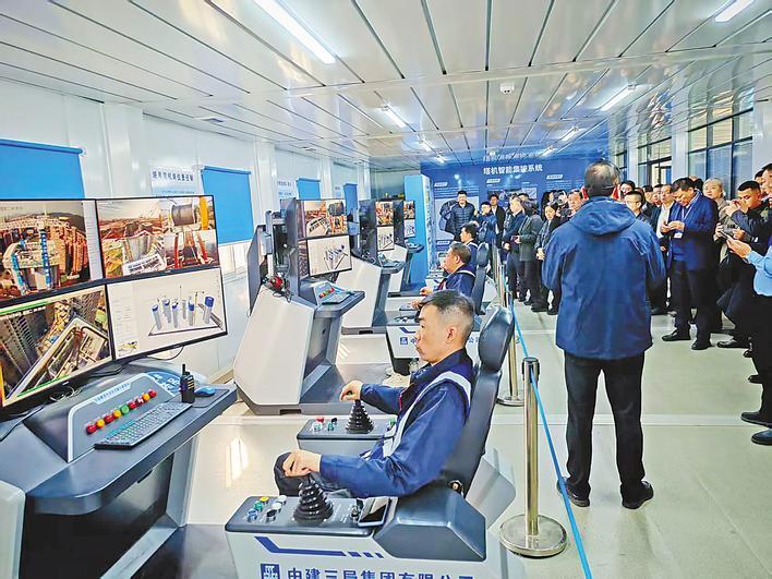 参会人员观摩远程集控塔吊。 (湖北日报全媒记者 戴文辉 摄)