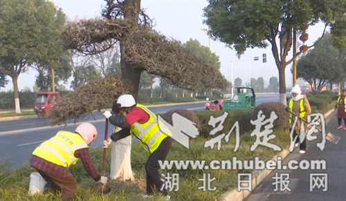 荆楚网(湖北日报网)讯(通讯员 赵继、常艳春)冬季是园林绿化苗木养护的关键时期。连日来,钟祥市园林绿化建设中心抢抓晴好天气,对城区绿化苗木开展集中施肥、修剪整形、绿化带裸土复绿等养护作业,为绿化苗木“强身健体”。