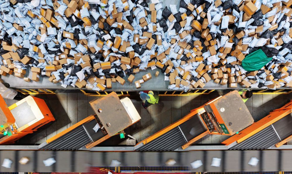 11月10日,在中国邮政集团有限公司江苏扬州邮件处理中心,工作人员在分拣快递包裹(无人机照片)。 新华社发(孟德龙摄)