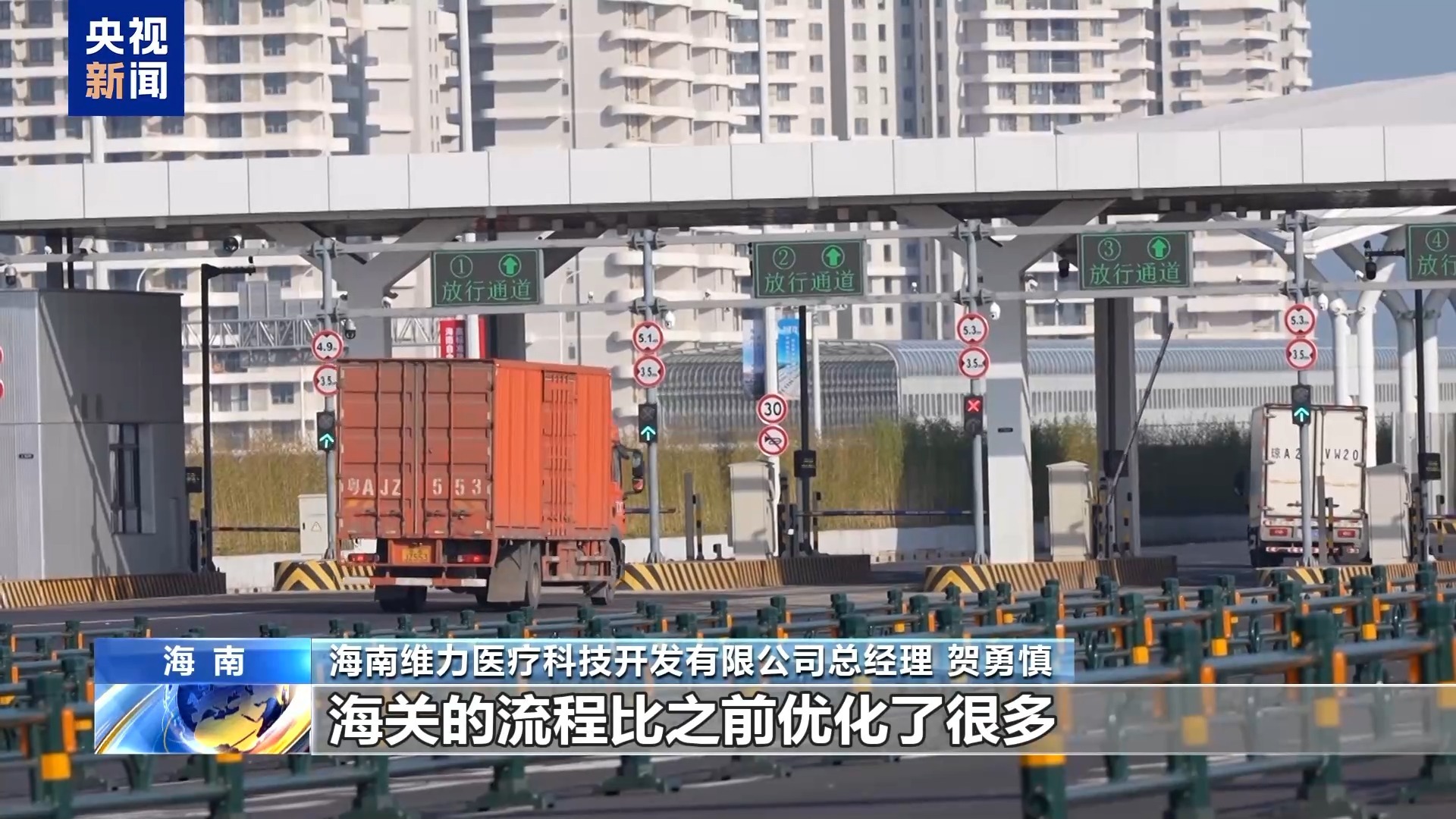 海南维力医疗科技开发有限公司总经理 贺勇慎:我们这是第一批“二线口岸”通关的,加工增值超30%免关税的产品,货值88万余元。通关的效率非常快,海关的流程比之前优化很多。我们是从大湾区过来投资的企业,落地海南自贸港,让我们的生产规模越来越大,我非常有信心,自贸港肯定会越来越好。