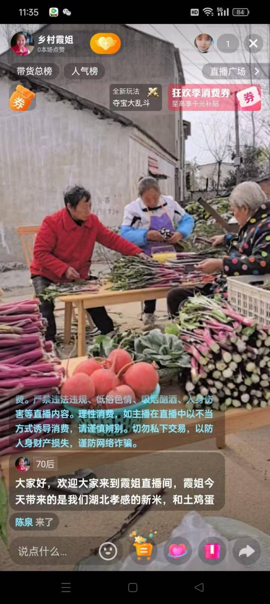 荆楚网(湖北日报网)讯(通讯员 陈泉)“家人们看清楚!这红菜薹脆嫩无筋,刚从地里割下来还带着露水。萝卜清甜多汁,生吃和凉拌都爽口,现在下单当天采摘、次日发货,新鲜直达!”近日,孝南区肖港镇大联村村民张光辉的抖音直播间热闹非凡,镜头前摆满刚收割的红菜薹、白萝卜、青白菜,翠绿鲜嫩的蔬菜搭配他朴实接地气的推介,吸引了大批网友驻足下单。