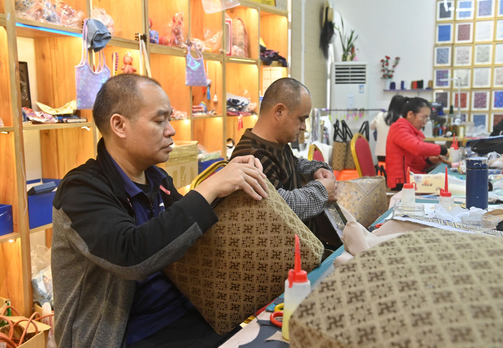 在广西宾阳壮锦文创馆,工人制作壮锦文创产品。广西宾阳县有着悠久的壮锦生产历史。近年来,该县在传统壮锦生产的基础上,积极推动壮锦文创产业发展,拓宽了当地劳动就业渠道。新华社记者 陆波岸 摄