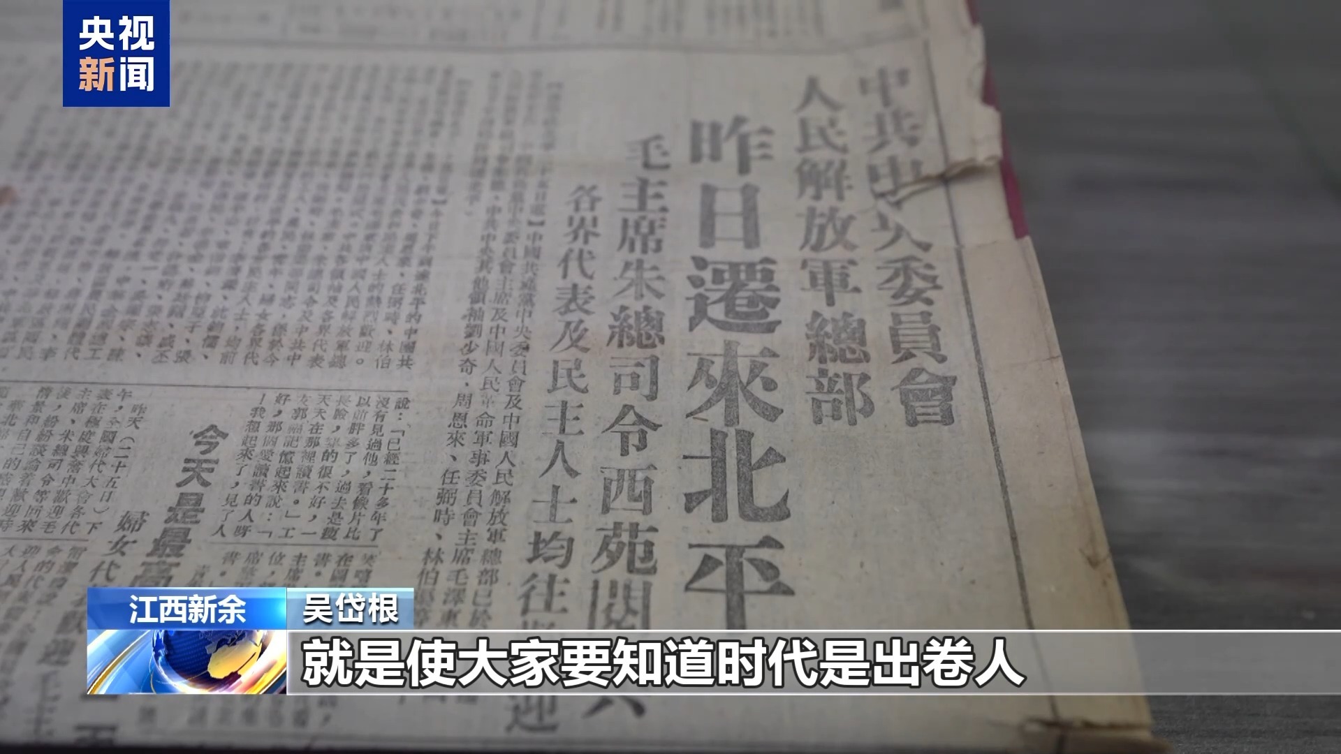 吴岱根:这份报纸是1949年3月26日的《人民日报》,报道了我们党历史上的重大事件,我们的中共中央机关从西柏坡搬迁到北京,后面总结为这段历史就是“进京赶考”。我把这个报纸展示出来,就是使大家要知道时代是出卷人,我们是答卷人,人民是阅卷人。使大家知道“赶考永远在路上”。