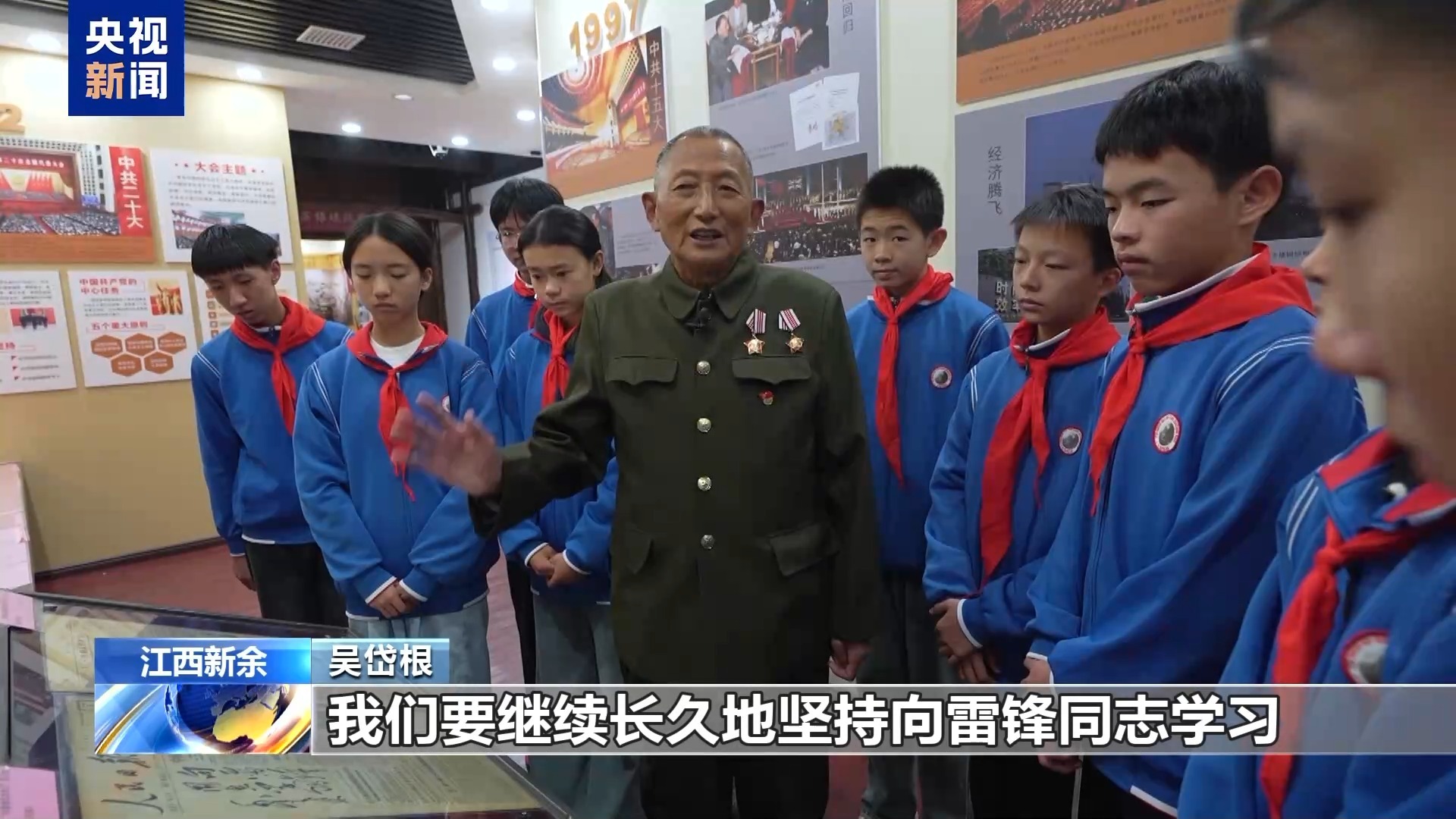 在新余市渝水区下村镇党员教育基地的展厅里,吴岱根正向孩子们讲解《人民日报》上面刊登的雷锋故事。