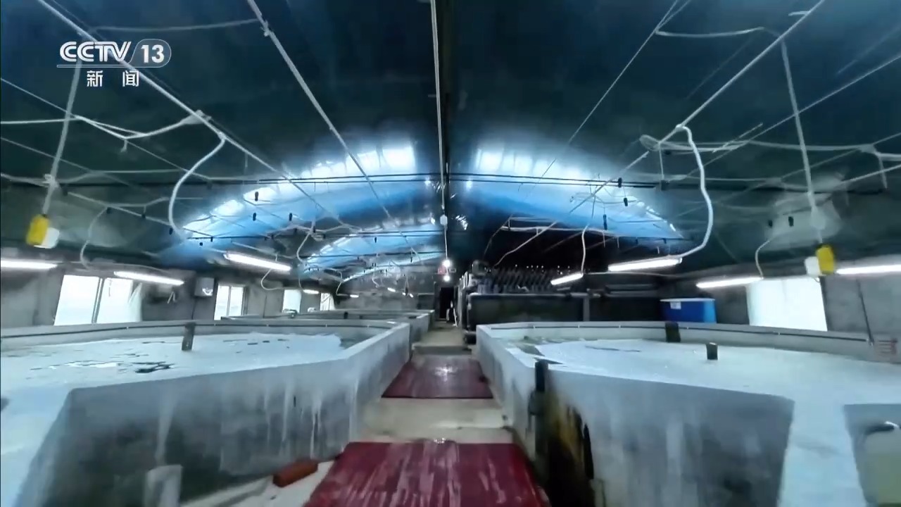 总台记者 苏琪淇:可能大家会好奇,如此大费周章为三文鱼“搬家”,值得吗?这背后和三文鱼的洄游习性有关,野生三文鱼会从淡水育苗,再游向深海生长,山东的陆海接力养殖技术,正是复刻了这种优质生长环境——幼苗阶段放在陆地淡水车间,能精准调控水温、水质,隔绝病害和极端天气,幼苗存活率超90%;等长到2公斤左右,成为“少年”,就能转入深海网箱,深海海水流速快、水质洁净,让它们有更充足的活动空间;等到明年6月,它们就能长到4.5公斤左右的成品规格。而且到了夏季高温时,还能将三文鱼转移到更深海域度夏,实现全年不间断养殖。这套标准化转场流程,革新了渔业生产模式,让三文鱼每个生长阶段都能处在最优环境。