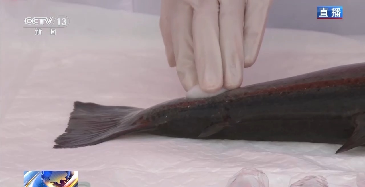 中国水产科学研究院黑龙江水产研究所 赵然:其实这和给人抽血是一样的道理,抽血时会先安抚鱼体,降低它的应激反应,然后在采血点用酒精棉消毒,从尾静脉抽取少量血液。