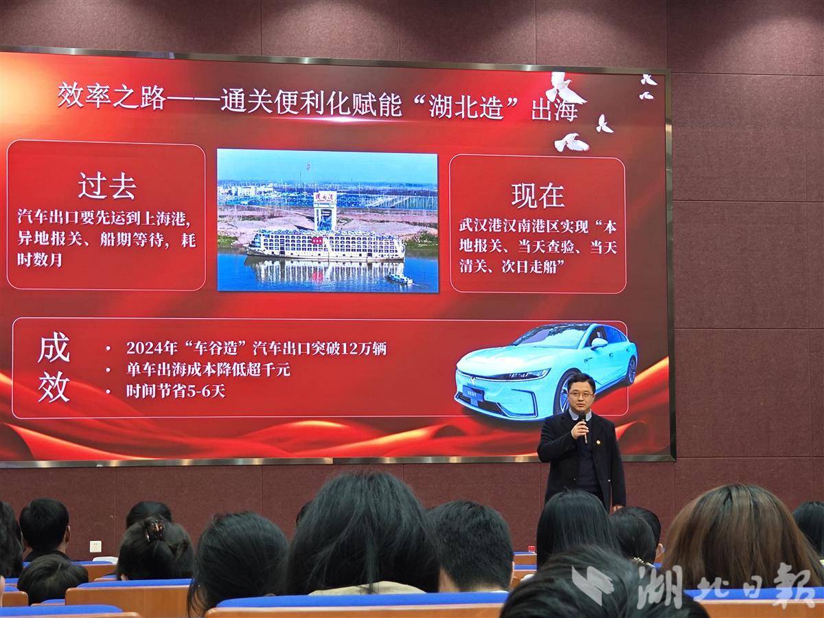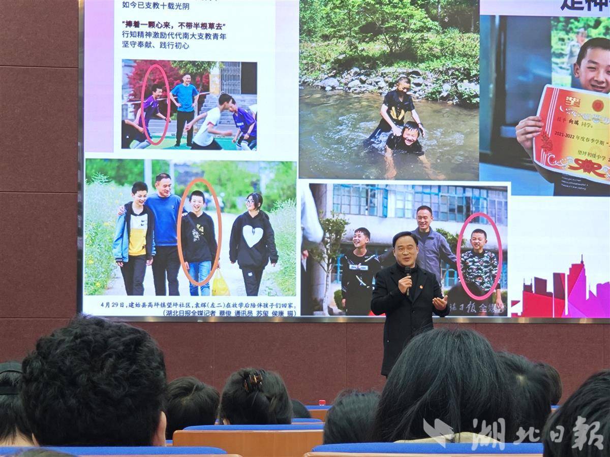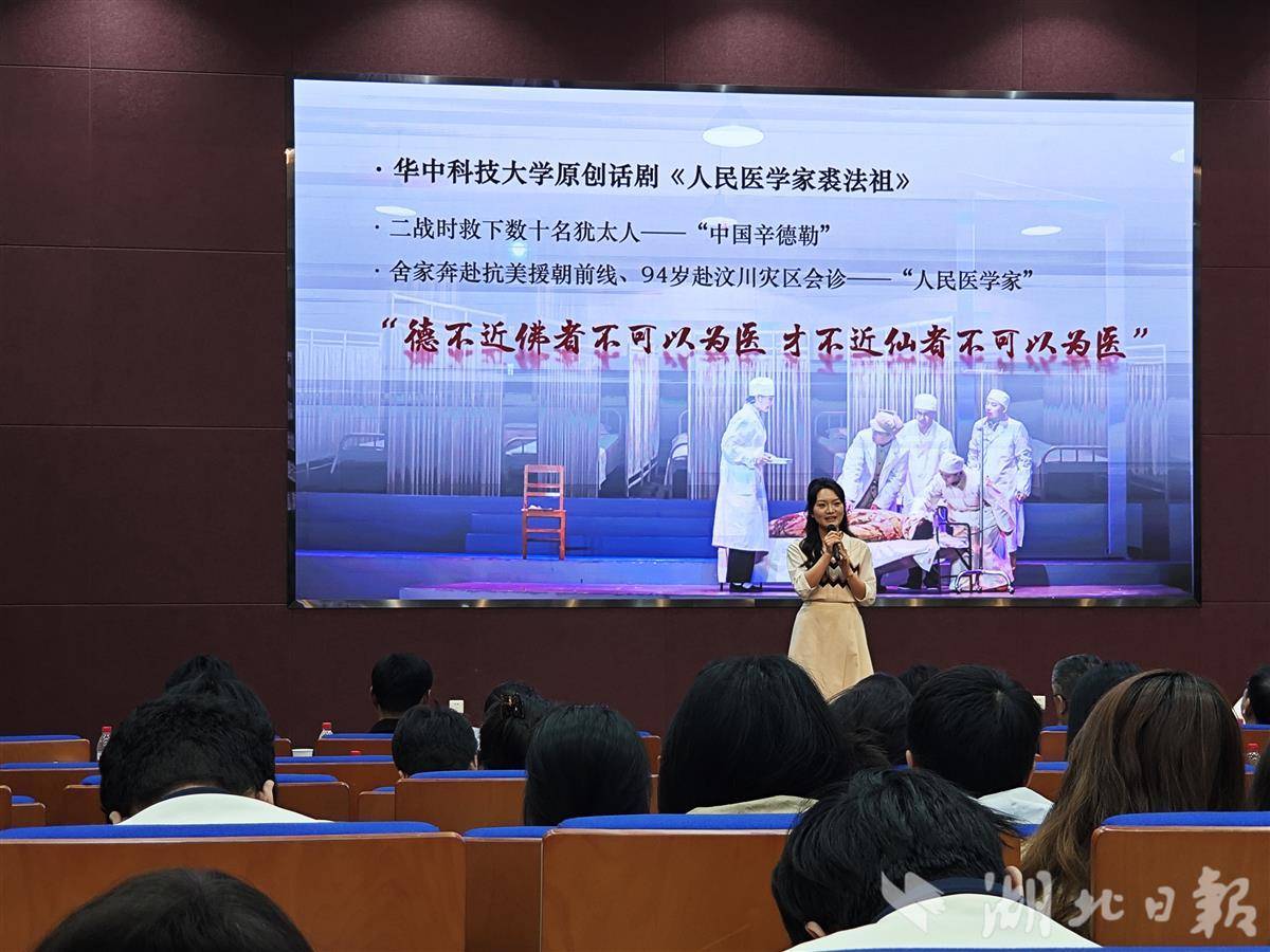 中国青年五四奖章获得者、建始县高坪镇望坪初级中学支教教师袁辉分享了他十多年如一日扎根山村学校的感悟,展现了教育强国路上乡村教师的努力与坚守;中南财经政法大学经济贸易学院副教授刘凯以经济发展的视角解读时代机遇,从专业知识角度出发带领同学们找准青年作为的方向;华中科技大学同济医学院公共卫生学院2025级硕士研究生邱俊妍则分享了参演话剧《人民医学家裘法祖》后,她从学生视角学习体会“人民至上”执政理念的切身感悟。