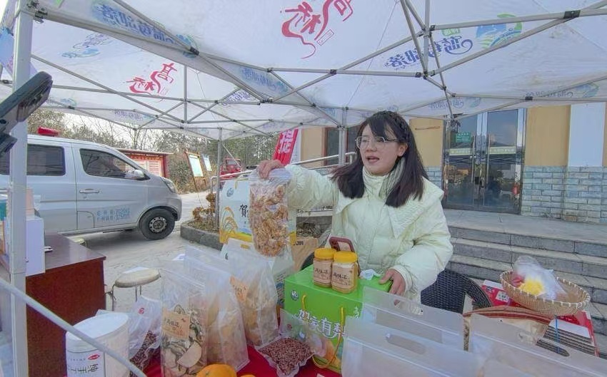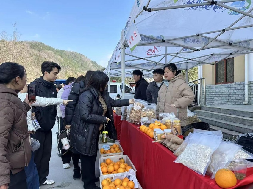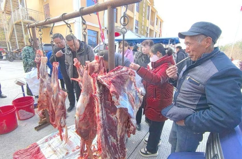 活动现场,一排排整齐的摊位上,各类特色农产品琳琅满目、香气四溢。高山蜂蜜色泽金黄、质地浓稠,开盖便能闻到醇厚的蜜香,是蜜蜂采撷山间百花酿成的天然佳品;九月红柑橘个大皮薄、果肉饱满,轻轻一咬,酸甜的汁水瞬间在舌尖迸发,冬日里吃上一颗,清爽又解腻;还有颗粒饱满、口感香脆的黑花生,风味独特、咸香下饭的农家豆豉,以及刚宰杀分割、肉质鲜嫩的新鲜猪肉和新鲜牛肉,更是抢手货,每一样都带着浓郁的乡土气息,游客们你一斤我两斤,争相把各种原生态的美味带回家,扫码付款声、讨价还价声与欢笑声交织,汇成了乡村振兴的动人乐章。