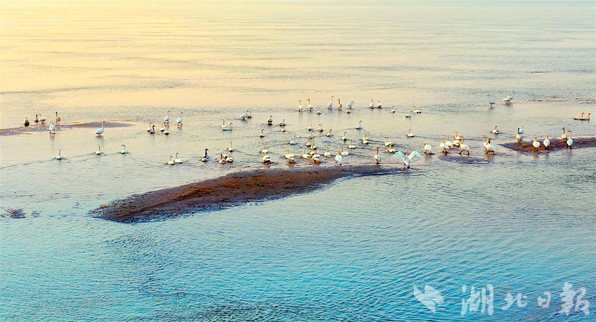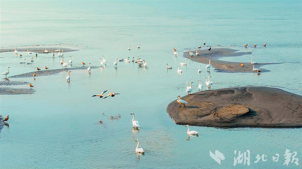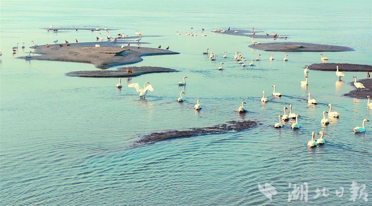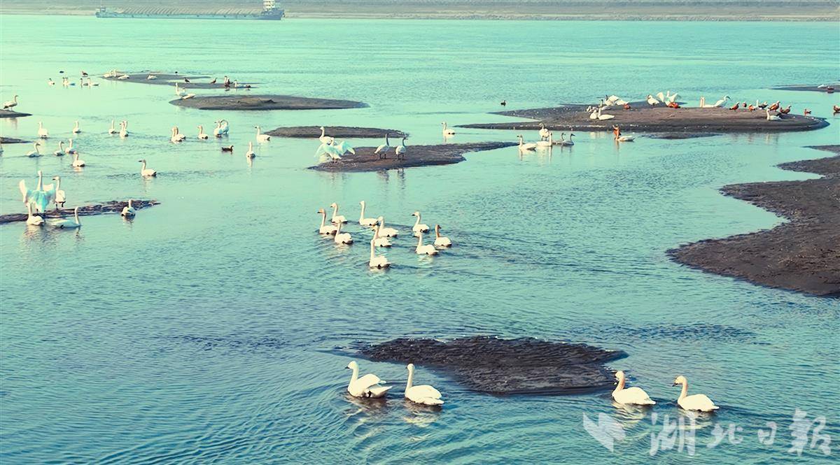 12月18日,鄂州市华容区芦花村旁的长江中,成群结队的天鹅、赤麻鸭等越冬水鸟或嬉戏、或飞翔、或在江中的滩头上休憩,成为当地一道亮丽且灵动的生态风景线。近年来,华容区建立河(湖)长巡查机制,加强长江岸线的环境治理,发动志愿力量参与,构建长效护江格局。群众生态环境保护意识不但提高,生态环境持续改善,来此越冬的候鸟数量逐年增多。(视界网 方仲华 吕炎明 摄)