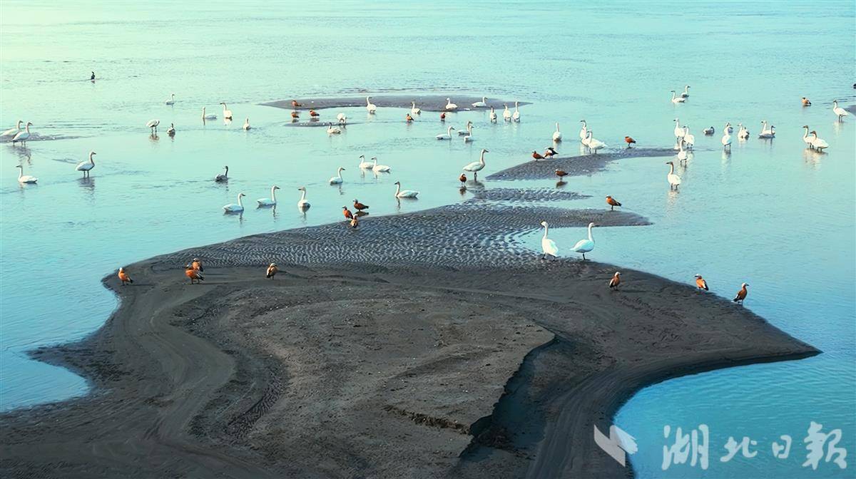 12月18日,鄂州市华容区芦花村旁的长江中,成群结队的天鹅、赤麻鸭等越冬水鸟或嬉戏、或飞翔、或在江中的滩头上休憩。