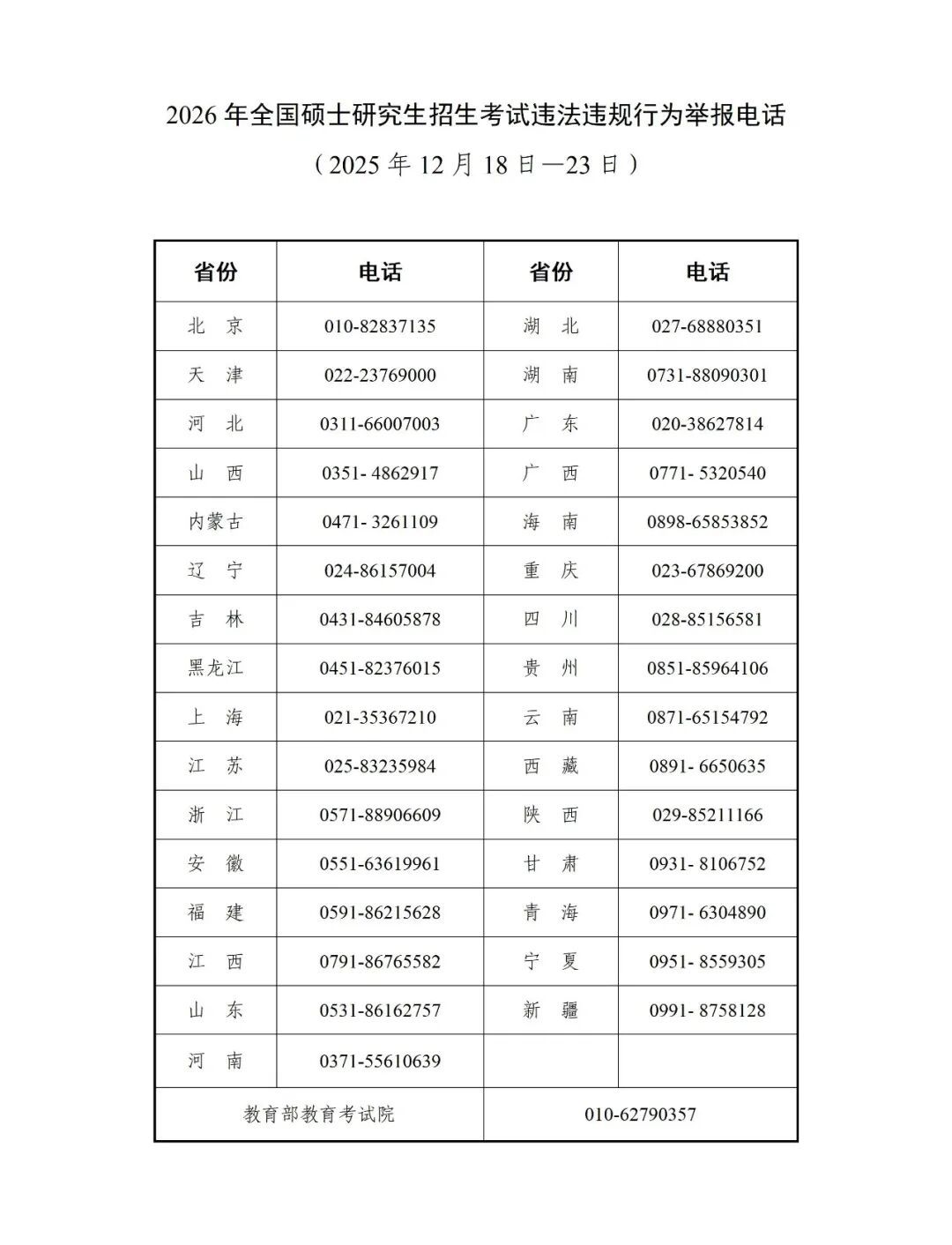 18日,教育部公布招考违法违规行为举报电话,欢迎广大考生和公众参与监督。
