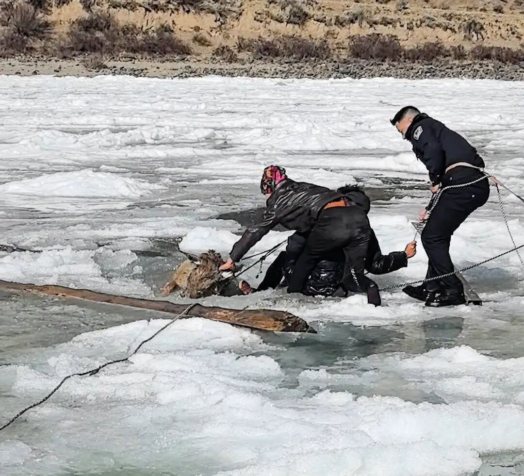 零下10度,时间就是生命。辅警降拥扎西带头踏入冰冷刺骨的河水中,靠近白唇鹿所在位置后,利用救援绳索将被困白唇鹿精准套牢,岸边的警民齐心牵引。历经一小时的救助,3只被困白唇鹿逐一被救起。