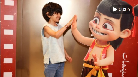 ↑2025年6月25日,在沙特阿拉伯利雅得,观众在《哪吒之魔童闹海》的宣传展板前拍照留念。当晚,阿拉伯语配音版《哪吒之魔童闹海》在沙特首映。