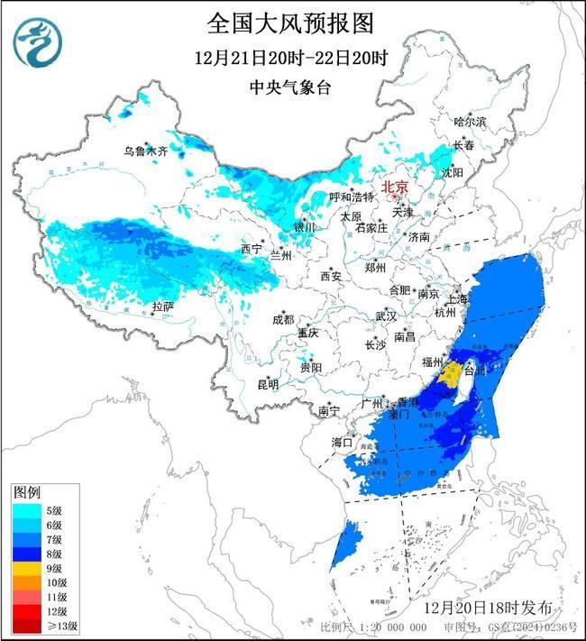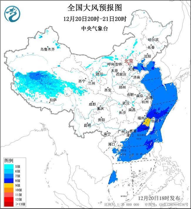 中央气象台12月20日18时继续发布大风蓝色预警。预计,12月20日20时至21日20时: