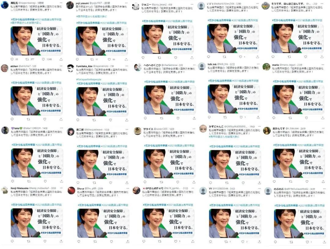 日本社交媒体平台充斥如“当然只能支持高市早苗”“高市早苗拜托了”等内容相似的帖文。