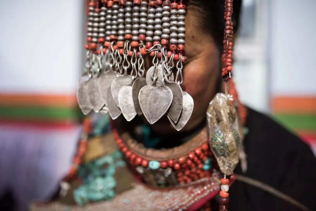 普兰妇女的“飞天服饰”极其华丽,由头饰、耳环、项链、胸饰、腰带等组成,其中最为珍贵的是传承数代人的镶满珠宝的“嘎乌”(护身盒)。