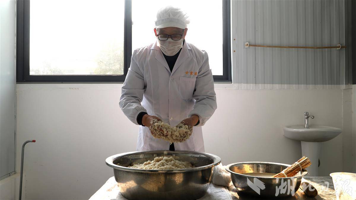 省级非遗传承人魏兆合将酒曲和糯米搅拌在一起。