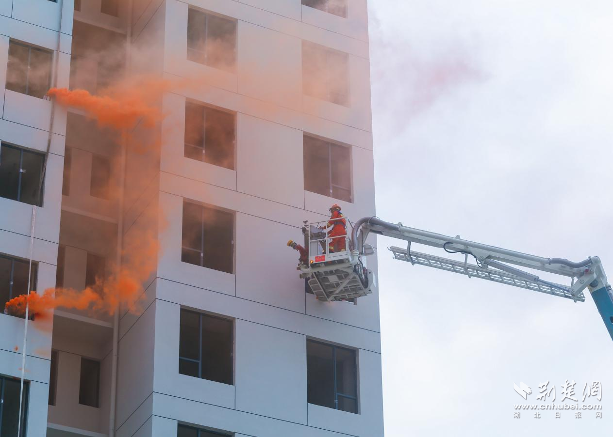 图为随州市消防救援支队在紫云府小区开展高层住宅消防安全演练
